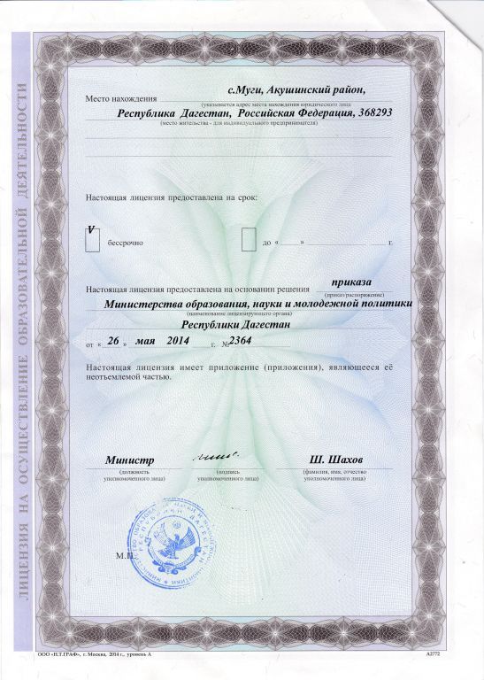Образовательная деятельность осуществляется по адресу: село Муги Акушинский район ул.М.Гаджиева дом 66