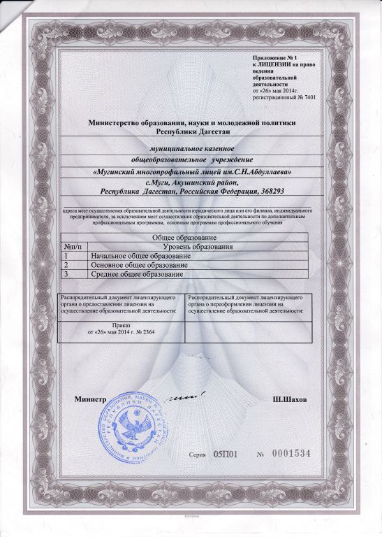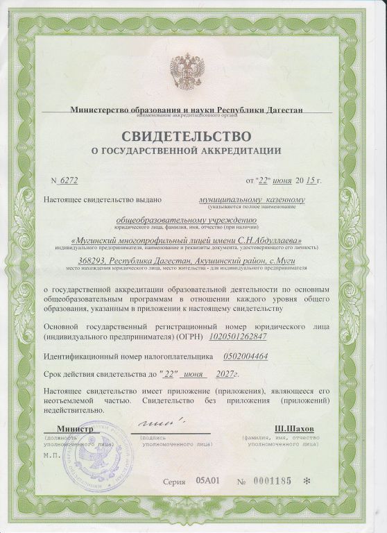 Полное наименование образовательной организации* Муниципальное казенное общеобразовательное учреждение "Мугинский многопрофильный лицей им С.Н.Абдуллаева"